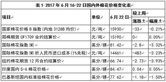 中國棉花市場周報(2017年6月16-22日):本周(2017年6月16-22日)國內棉花、棉紗現貨價格維持弱勢,鄭棉期貨區間振蕩;國際棉花期現貨價格繼續大幅下跌,外紗整體走弱;內外棉花價差擴大、棉紗價差縮小。