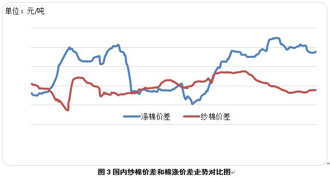 3、國內紗棉、滌棉價差略有擴大。 本周國內紗棉差價7390元/噸(32支普梳純棉紗-3128B棉花價格),較上周擴大13元/噸;滌棉差價8380元/噸(3128B棉花價格-滌綸短纖價格),較上周擴大2元/噸(見圖3)。